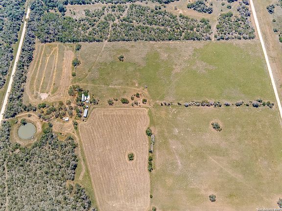 This stunning, ag-exempt property is sprawled amongst 106 acres that have been beautifully maintained with legacy oak trees and a fertilized open pasture. Fully fenced, the coveted gated entry guides homeowners to the charming home built on this multi-use ranch. The country-style interior is met with original wood paneling, tin ceilings, and classic picture windows. The floor plan flows seamlessly through the common areas with a dedicated dining room off the living area. The kitchen also has access to the outdoors. Two full bedrooms and two baths complete the interior. The lovely front and back porches are ideal for enjoying a morning cup of coffee while the covered patio makes for al fresco dining with an outdoor kitchen. Cool off in the hot months by enjoying the pool year-round with the glistening pool and spa feature. Two barns can be found on the property in addition to two stock tanks, two barns, and three water wells, perfect for horses and sustainability. Nestled off the frontage with double public roads and conveniently located 60 miles from San Antonio and 80 miles to Corpus Christi, this is the perfect opportunity to explore the ranch life possibilities.