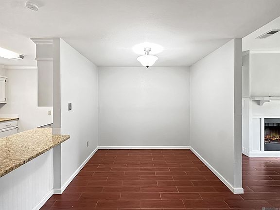 Make sure to click the virtual tour walk through! This charming 2BR/2Bath residence, on a dead-end street, offers a blend of updates and low-maintenance living. The exterior has: 9 year old roof, double car attached garage in rear, a termite contract in place that provides peace of mind and not in the flood zone. Inside is an open floor plan with wood-look tile flooring throughout—completely carpet-free for easy upkeep. The kitchen has slab granite countertops, an oversized breakfast bar, and includes a refrigerator that remains. All appliances are 8 years old. This functional floor plan has a separate dining area, and spacious living room featuring a newly installed fireplace and built-in shelving. There are ceiling fans in all bedrooms and the primary bedroom offers a private full bath and a spacious walk-in closet. With neutral paint throughout, the home is bright and inviting.