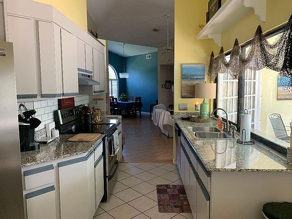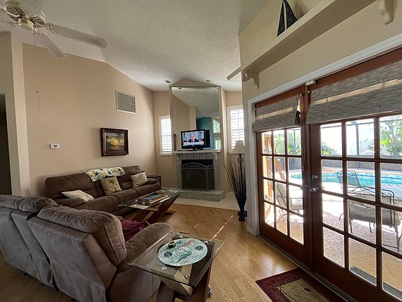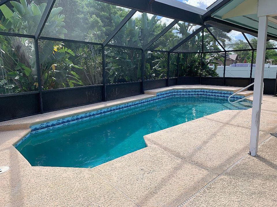 New Metal Roof and a Pool! Nestled in a quiet neighborhood, this inviting 2-bedroom, 2-bathroom home offers high ceilings, laminate floors and tile throughout, kitchen overlooking the great & dining rooms and more... The split-bedroom layout offers privacy, the primary suite includes a large walk-in closet & shower and soaking tub. Large corner lot with extended concrete pad for parking boat, RV, or extra vehicles. Covered patio overlooking pool with cage with pool heater for year round use.