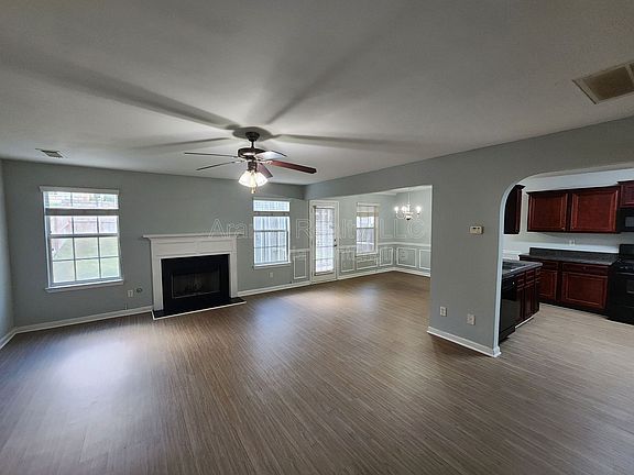 - Spacious three-bedroom layout with vaulted ceilings in every bedroom and an open-concept dining and family room further enhanced by a decorative fireplace.