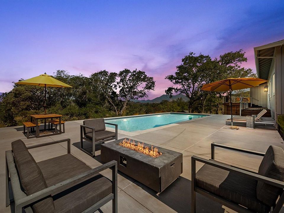 Sparkling poolRolling sonoma hillsidesQuiet laneGenerous primary suiteExpansive decksFirepit with mountain views