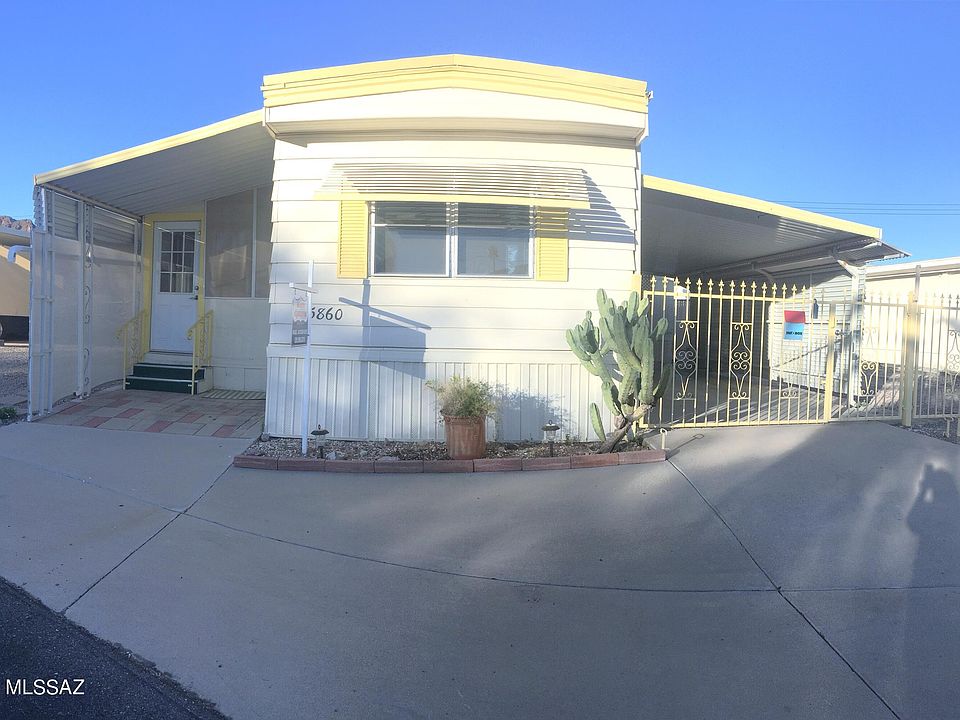 Lovely manufactured home in the desirable Tucson Estates 55+ Community located in SW Tucson. Home includes an Arizona Room that is well-insulated with a wall-unit A/C, carpeted floor, and doors leading to the front of the property, and a back door that leads to paver patio area with workbench and small shed. Indoor washer/dryer. HOA amenities include free golf, 2 pools, spa, tennis courts, bocce ball, social clubs, clubhouse, and much more!