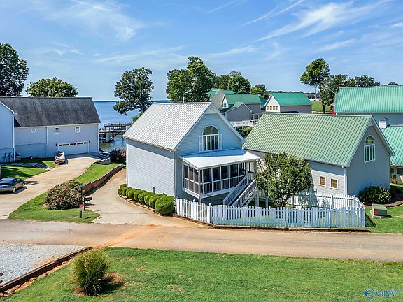 LAKE LIFE AWAITS! Wall of windows + 18’ ceilings pull Wheeler Lake/Tennessee River views into your living room. Wide-open plan with beautiful hardwoods, stainless appliances, loads of cabinets and large kitchen island-perfect for gathering.Owner’s suite boasts a spa bath with soaking tub, walk-in shower and newly built screened patio. 2BR/2BA. 2-car garage has a mini split for year-round use + small fenced yard for your pups! New roof 2024. HVAC 2018. Shared ownership of private boat ramp, pier & gazebo in cul de sac. Cart friendly area w/full-service marina & dining. No HOA!This is easy lake living with space to relax and entertain-ideal full-time, weekend or income property!