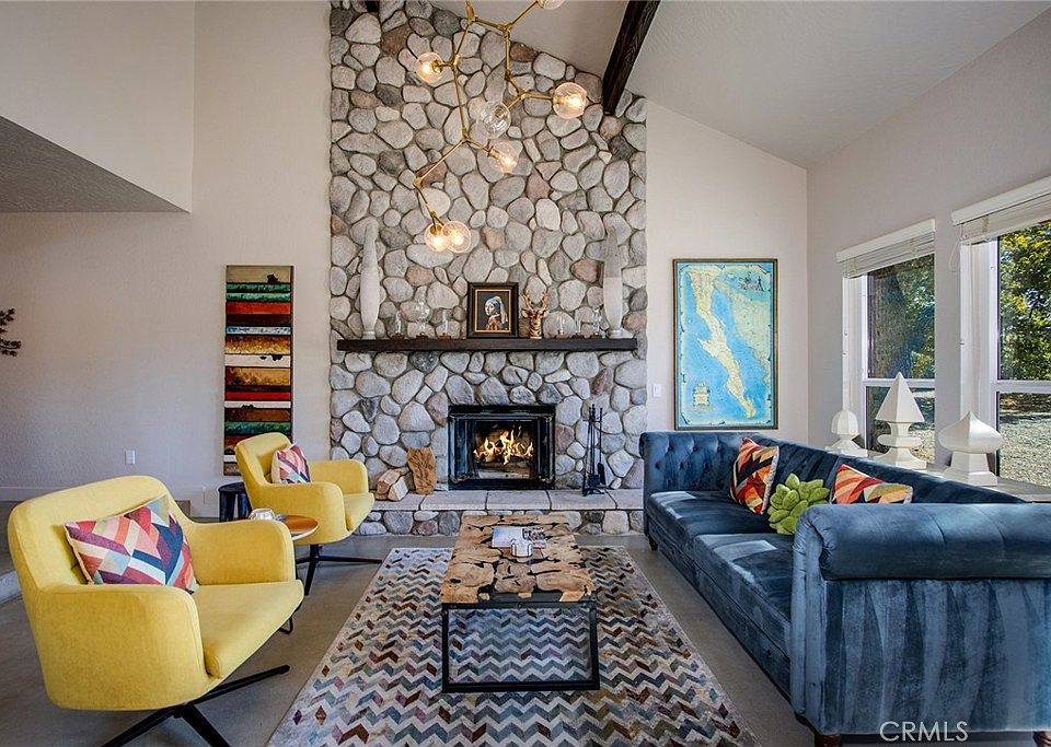 Step inside to a grand two-story living room anchored by a massive stone wood-burning fireplace, with walls of glass framing panoramic desert and mountain views. The open floor plan flows into a formal dining area and a chef’s kitchen with premium finishes, ample counter space, and a cozy breakfast nook. A second living area with a pellet stove fireplace provides a warm and inviting retreat.