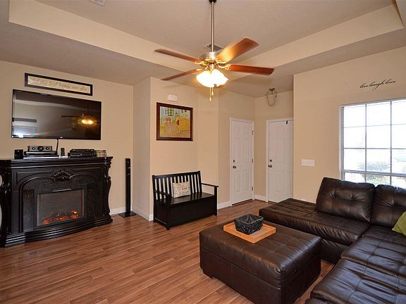 Immaculate one owner home ready to move into. Wonderful open living room features beautiful wood laminate flooring, recessed ceiling and ceiling fan. Living room opens up to the kitchen which includes breakfast bar, custom tile flooring with inlay and back splash. Kitchen also has staggered cabinets with crown molding, pantry, recessed lighting and easy access to the covered back patio. The custom tile flows down the hall to the Guest bath room. Laundry room is just down from the kitchen and includes a washer and dryer. Two additional bedrooms with like new carpet replaced just one year ago, both bedrooms also have spacious closets with double doors. Master bed room is light and bright with wood laminate flooring, recessed ceiling and ceiling fan. Master bath features double sink vanity and a spacious walk in closet. Outside you will find a nice covered patio, privacy fenced back yard with a custom fire pit. This is a great home with everything you need, just waiting for a new family. Don't miss this opportunity to purchase this amazing home. Make your appointment today.