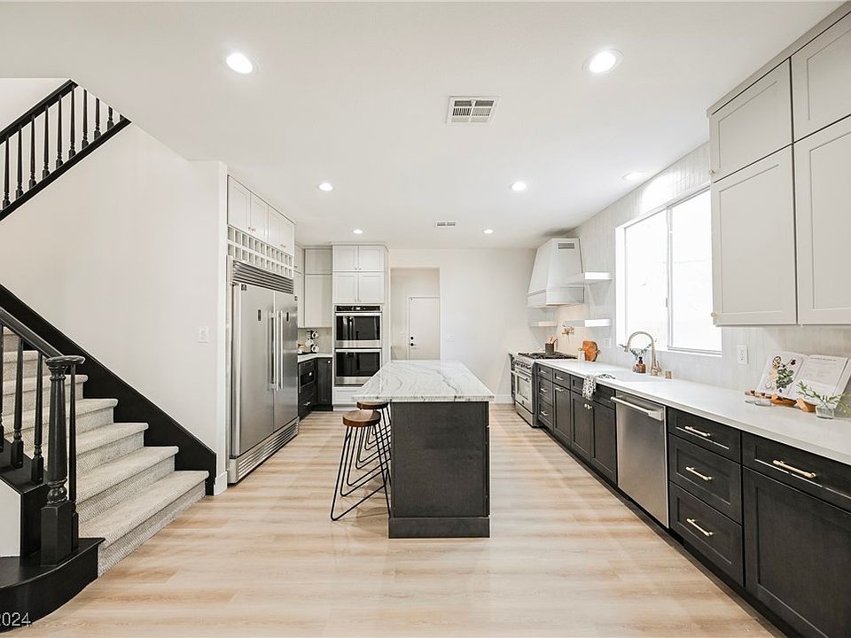 - Description: Breakfast Bar/Counter,Custom Cabinets,Island,Lighting Recessed,Luxury Vinyl Plank,Marble/Stone Countertops,Quartz Countertops,Stainless Steel Appliances