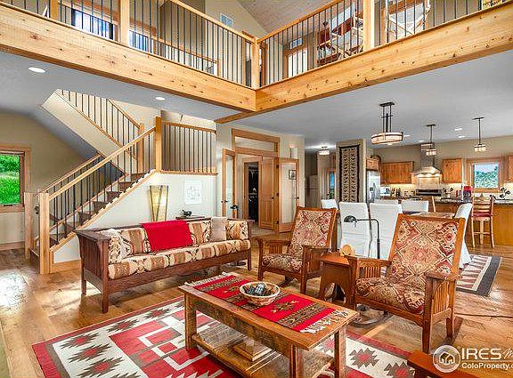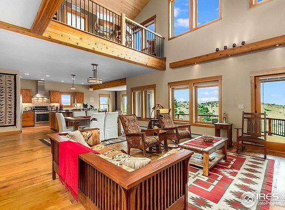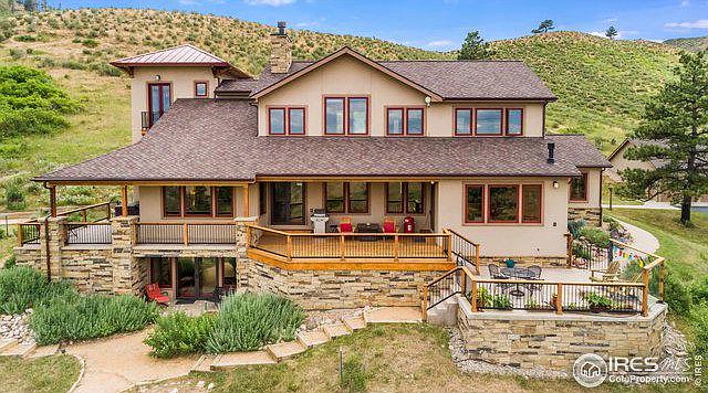 Enjoy spectacular views of the Bellvue dome, hills and plains from this custom 2 story with walk out basement and over 1900 Sq. ft. 5 car garage including a 38 ft RV space. Secluded country living in gated community on 35 acres all just 20 min from Old Town Ft. Collins and CSU. Open floor plan with 2-story stone fireplace and high end finishes throughout: rough-sawn oak floor, large kitchen island, granite counter tops, main floor master, hot tub, sauna, sunroom, pool table, 2 gas burning stoves, large deck, 20 solar panels. Views from every window! Privacy, serenity, nature, like vacation at home!