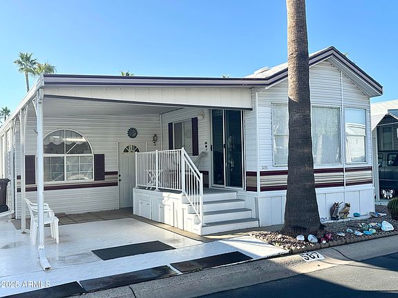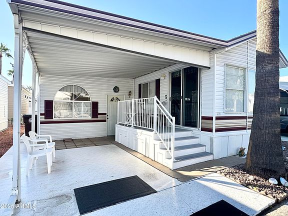 Wow-take a look at this BEAUTIFUL PARK MODEL home located in a vibrant 55+Resort Community! Known for endless activities, a fantastic location, and a warm, welcoming atmosphere, this home is truly a standout. This SOUTH facing gem offers great curb appeal, WONDERFUL MOUNTAIN VIEWS, and a SPACIOUS OUTDOOR SETUP perfect for entertaining. Enjoy the LARGE BACK PATIO ideal for lounge chairs, patio furniture, and soaking in the AZ sunshine! You'll also love the nice front deck-a relaxing spot to enjoy morning coffee with views of the mountains! Inside, the POPULAR floor plan features a GRAND front living area with large windows. laminate wood-look flooring and warm neutral colors, creating an inviting and comfortable atmosphere. The kitchen offers good counter cooking space, a practical layout, and plenty of cabinetry and storage for all your needs. This home offers 1 bedroom, 1.75 bathrooms, giving you comfort & convenience for both you and your guests! The main bathroom includes a tub/shower combo and generous vanity space. The AZ room bathroom features a WALK IN SHOWER, plus a STACKABLE WASHER/DRYER for added convenience. The AZ room itself is warm & welcoming, with new sliding glass doors that bring in amazing natural light & access to the back patio. The bedroom offers 3 split closets, tons of drawer space, and includes a QUEEN SIZE bed with an adjustable base. Tastefully furnished, everything you need to start enjoying! The park model also features a newer water heater, approximately 5 yrs old. And BEST OF ALL--YOU OWN THE LAND! Come enjoy comfortable living, easy entertaining,and enjoying the resort lifestyle to the fullest! Don't miss this one!