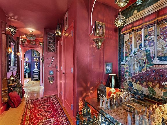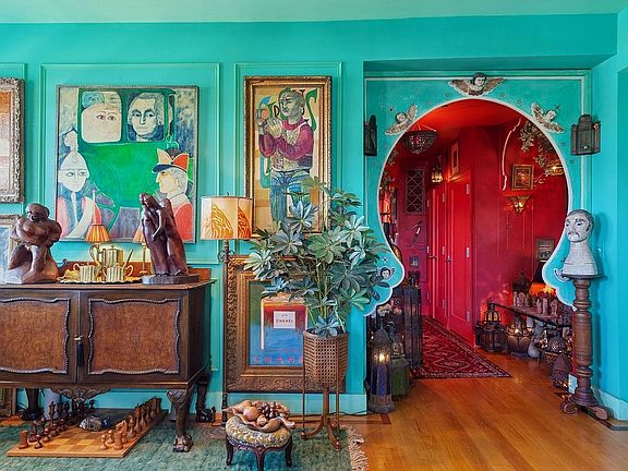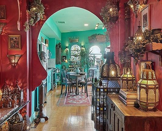 Come inside to a world of rich jewel tones, ornate moldings, and architectural flourishes-from decorative columns to a custom mantle-that evoke the ambiance of everything from a Moroccan palace to an antique store to a whimsical theater set! Every corner is curated with exotic artifacts and curios, making the space feel like a living gallery exhibit.