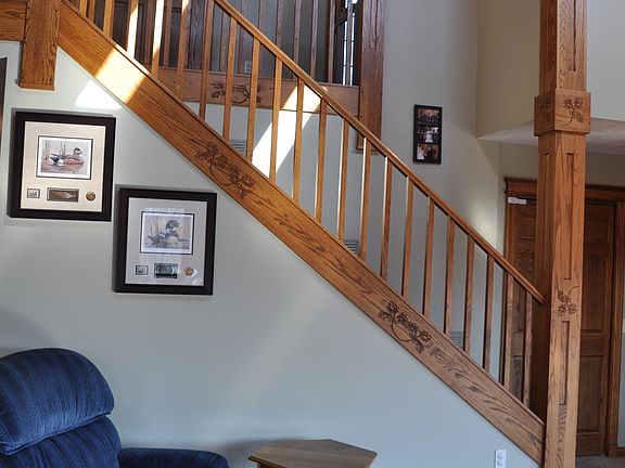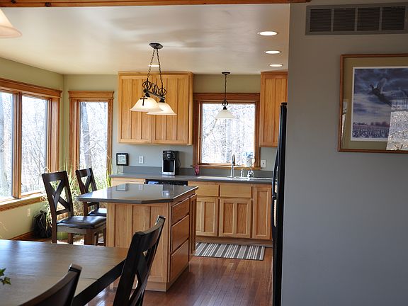 Located on 9.3 acres custom built with quality workmanship and trim throughout which is evidenced from the main level which features a beautiful kitchen with corian counter tops, and a center island to the unique dining room overlooking the beautiful grounds, a master bedroom, bath and laundry to the large living room with cathedral ceilings, a beautiful stone fireplace and then up the open stairway to 3 bedrooms, full bath and an additional room for office or play. Downstairs you will find a family room, rec room, office area, bedroom and full bath. There are wood floors and wonderful custom woodwork throughout and the open staircase is beautiful. Multi level decks to enjoy the peace and tranquility. The upper deck has propane plumbed to it for your grill. Acreage for horses, hunting or play if you so desire and a 40x64 pole building with 14' ceilings which is partially heated. This home was built in 2003 and is a great buy. Fiber Internet to the Home ran Spring 2016