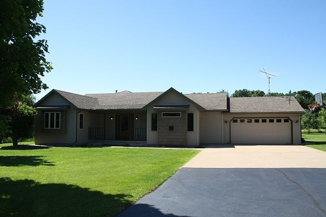 Great blend of wooded pines, crab apple trees and five plus acres. Nice solid ranch home offers four bedrooms, two baths and many new updates. Kitchen has newer custom maple cabinets, quartz counter tops and beautiful hearth room with fireplace. Enjoy your morning coffee in the sun room adjacent to the master bedroom. Sixty by sixty three pole shed, heated workshop and chicken coop with electricity.