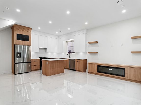 Front unit duplexOpen-concept layoutSleek kitchenQuartz countertopsGas rangeStainless steel appliancesRadiant heating