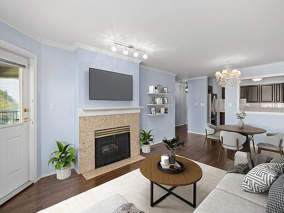 Enjoy a relaxed lifestyle in this bright, adult-oriented top-floor suite designed for easy, low-maintenance living. On the quiet North side of the building, a generous balcony frames mountain and garden views for a peaceful retreat. The comfortable layout inside includes a spacious living & dining area, two bedrooms, a large bathroom with separate tub and shower, in-suite laundry, and a cozy gas fireplace. Tastefully renovated with stone counter tops, sleek stainless appliances, wide slat blinds, and laminate floors. Pet-friendly and well-maintained, the home comes with a parking stall and storage locker, and sits close to transit, the Legion, groceries, and dining. At least one resident must be 55+.