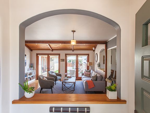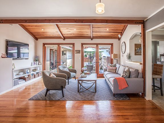 Direct your feet to the sunny side of the street in this meticulously remodeled 3 bedroom 2 bath CA ranch style home. At 1,726 square feet on a 7000+ lot, you will leave your worries on the doorstep with mature landscaping and curb appeal to spare. The open concept dining/ living room gleam with hardwood floors, wood burning fireplace and custom French doors beckoning to the outside. The remodeled kitchen has stainless appliances, breakfast bar + washer/dryer tucked nearby. On the other side of the home, a true Master retreat, with Cedar-lined closets and bath with soaker tub and dual sinks. 2 additional bedrooms share a remodeled full bath. Finally, a den with more French doors to a patio that seamlessly connects the two wings of the home. Upgrades include central air and heat, new plumbing, 2 car garage, digital thermostat and an alarm system. Your life will be so sweet, in this home on the sunny side of this street.