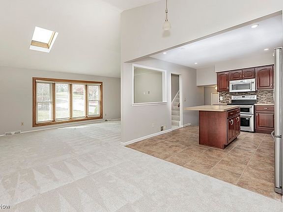This Contemporary 3 Bedroom, 2 Bath home sits at the end of a cul de sac in a quiet, charming neighborhood. Enjoy the open floor plan of the main living area. Vaulted ceilings and skylights in the living room and dining area provide plenty of natural light along with the large bow window in the living room. Views of the wooded backyard can be enjoyed in the dining area. The large, open kitchen has newer cabinets with under cabinet lighting, newer stainless steel appliances, a large center island offering a breakfast bar and recessed lighting. There is a half bath on the entry level as well as a large pantry. The second level offers 3 bedrooms and a spacious full bath off the main bedroom with his and her full vanities, a bath tub with glass door and closet. The lower level has a large recreation room with a walk out glass door that opens to the patio and provides access to steps to the deck. The laundry is in the unfinished part of the basement as well as a shower and the mechanicals. There is a transferable warrant for waterproofing of the basement. Newer carpeting has been installed throughout the entire home and many rooms have been freshly painted. The large covered deck can be accessed from the garage man door. This private deck overlooks a serene wooded backyard that is home to plenty of wildlife. The two car attached garage has been recently painted, has great lighting and room for storage and handiwork. Two bridges are being constructed behind the homes at the end of the cul de sac for the Solon to Chagrin Falls Hike/Bike Trail. This home is just minutes from the Cleveland Metroparks and Chagrin Falls Village. Enjoy the outdoors, great dining and shopping and easy freeway access to Cleveland.