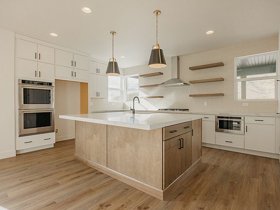 Elegant black iron railingVented hoodGourmet kitchenaid appliance packageUpgraded tileDouble ovensFloating shelvesCeiling-height soft-close cabinetry