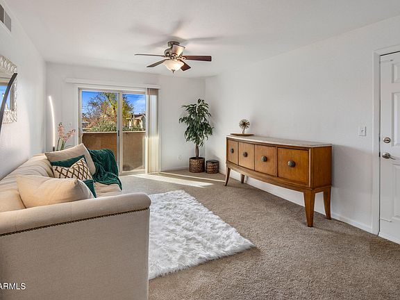 Welcome to this charming, warm condo in a great Scottsdale location. Move-in ready with fresh paint, this cozy upstairs condo has double-pane vinyl windows, stainless appliances, and an updated bathroom. The large bedroom has an ample walk-in closet. Relax on a nice-sized covered balcony with a storage closet. The furniture is available if desired. The low HOA fee of $286 per month includes heating & AIR CONDITIONING, water, trash/sewer, and a blanket insurance policy. Here's your opportunity to own a wonderful condo in Scottsdale's desirable 85250. The unit is within walking distance of restaurants, shopping, and entertainment, with quick access to the freeway. This is a great deal, so come take a look!! 6 Month Minimum for Rentals so NO AirBnB or VRBO.
