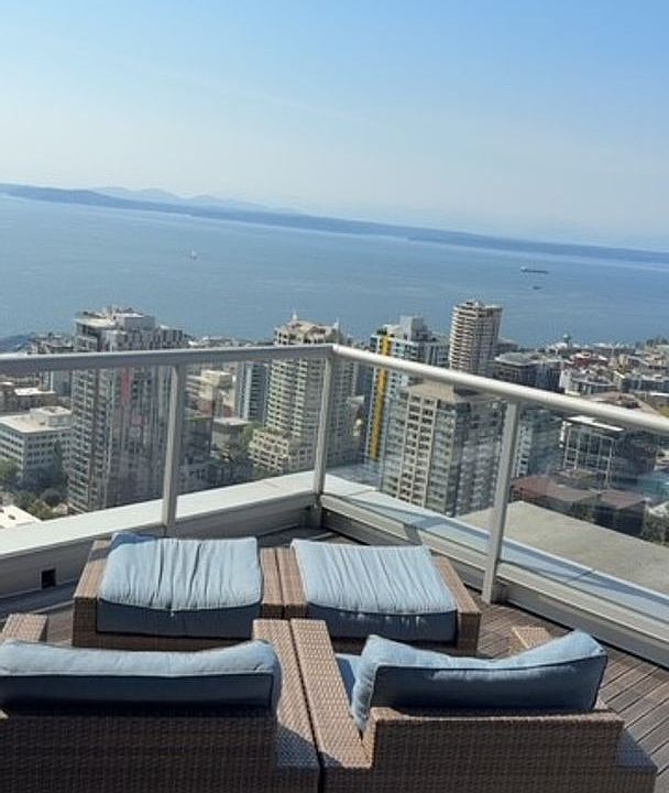 Expansive views: Floor-to-ceiling windows and a private balcony frame stunning, unobstructed views of Puget Sound, the Olympic Mountains, and the city skyline.