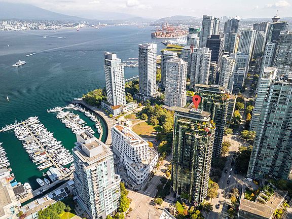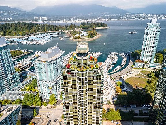 Discover waterfront living at Harbourside Park by Arthur Erikson! This two bedroom, two bathroom unit with den & office showcases stunning ocean, marina, mountain & city views. Includes a double-sized storage locker and TWO side-by-side parking stalls. Enjoy resort-style amenities: indoor pool, hot tub, gym, private garden, party room, rooftop deck, visitor parking & on-site management. Conveniently located steps away from the seawall, Stanley Park, beaches, biking, shopping, dining, markets, schools, transit & sky train. A proactive strata and strong contingency make this a well-managed building you can invest in with confidence. Open house Sunday October 5th 2-4pm.
