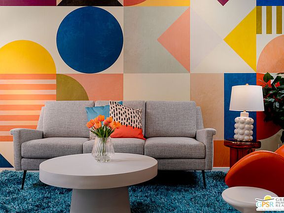 Immerse yourself in the quintessential Palm Springs lifestyle at Querencia Palms - where home is more than a place, it's a feeling. This fully renovated and furnished 2-bedroom, 2-bath condo is the model unit of a newly released condo conversion, now available for the first time! Offering coveted Fee Simple ownership (not leased land), the home showcases terrazzo-inspired tile, sleek new carpet, vibrant mid-century inspired finishes, and playful wallpaper accents. The chef's kitchen is equipped with stainless steel appliances, while modern upgrades include keyless smart lock entry with fingerprint access and in-unit laundry. Enjoy two private patios - one overlooking the courtyard and the other opening to your own private section of the serene koi pond with flowing water features. Community amenities include a beach-entry pool and spa, outdoor BBQ and event space, three fire pits, a dog washing station and pet relief area, plus gated access with covered parking. Perfectly located in South Palm Springs - just steps from downtown, the CV Link, hiking trails, and dining. Querencia Palms blends style, comfort, and convenience with a true sense of community. A desert retreat designed for personality, charm, and well-being, so you can love where you live.