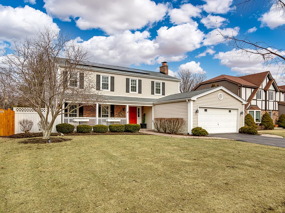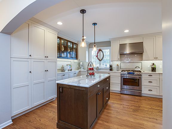 This stunning home is nestled on a beautifully landscaped, fenced lot, conveniently located near parks, restaurants, and everyday amenities. Boasting incredible curb appeal, the exterior features a front porch, elegant brick walkways, a charming brick patio and a picturesque pergola. Step inside and prepare to be impressed! The expansive formal living/dining flex space is filled with natural light from newer windows. Adjacent to this space is the chef's dream kitchen, completely redesigned in 2019, showcasing custom cabinetry, quartz countertops, an island, high-end stainless steel appliances, and a cozy breakfast nook. The inviting family room exudes warmth with its classic brick fireplace, built-in cabinetry, and gleaming hardwood floors. Upstairs, the primary suite features an updated private bath, and a spacious walk-in closet. The additional bedrooms are equally bright and include walk-in closets. The fully finished lower level offers a versatile recreation room, a dedicated office space, and a full bath. This home is an absolute 10+-a must-see!