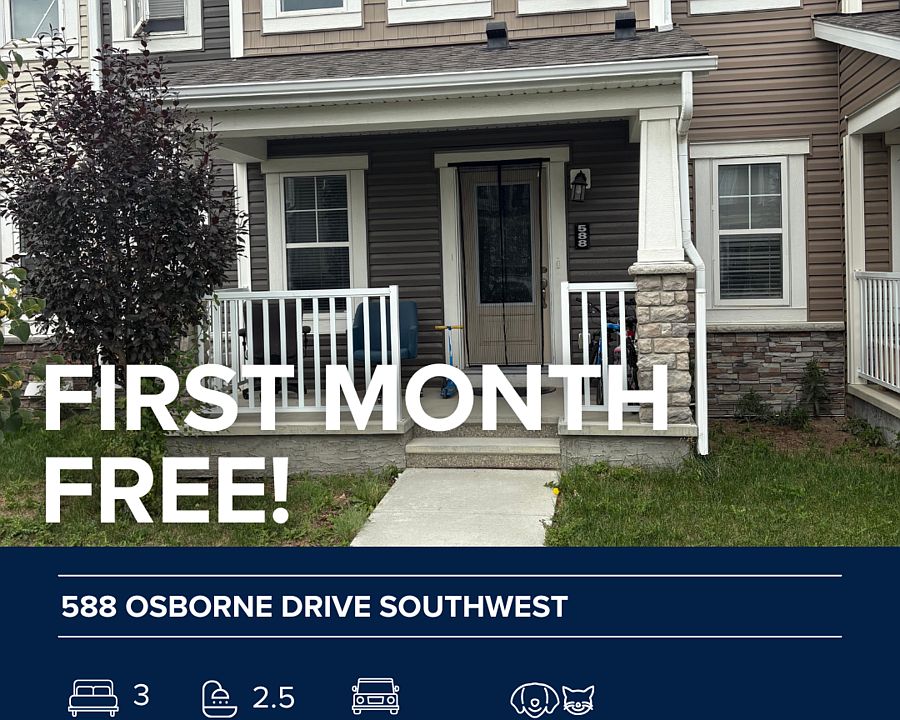Modern 3 Beds, 2.5 Baths TownHouse | No Pets Allowed | FIRST MONTH FREE IF MOVE-IN BY OCT 15/25 Welcome to your new home at 588 Osborne Drive Southwest a modern and well-maintained 3 beds / 2.5 baths / offering comfort, space, and convenience. Ideally located close to shopping, schools, parks, and transit. SHOWINGS: Conducted in an open-house format book your appointment today! Prices, availability, and promotions are subject to change without notice. PROPERTY DETAILS: - Furnished or Unfurnished: Unfurnished - Pets: No Pets Allowed - Smoking: Non- Smoking - Parking: Double Garage Attached - Storage Included: No - Laundry: In- Suite Laundry - Management Type: Full Management - Lease Term: Long Term UNIT FEATURES: - Living Space:Open-concept living room layout, perfect for relaxing or entertaining - Kitchen: Sleek and modern kitchen with all appliances for a contemporary look with plenty cabinet storage to keep everything organized - Dining Space: Open-concept design flowing into the living space, perfect for entertaining - Bedrooms: 3 Bedrooms featuring ample storage for clothing and accessories - Window Coverings: Includes window coverings for privacy and light control UTILITIES: - Utilities Included:No Utilities Included Here's a helpful tool you can use to get a rough estimate of utility costs. LOCATION HIGHLIGHTS: - Outdoor Living: Nearby Parks, Pathways, Greenspaces - Transit & Access: Transit Lines / Major Roads Nearby - Family Friendly: Close to Schools, Childcare, Rec Centres - Local Conveniences: Groceries, Shops, Restaurants, Services Nearby Don't wait properties like this don't last long.
