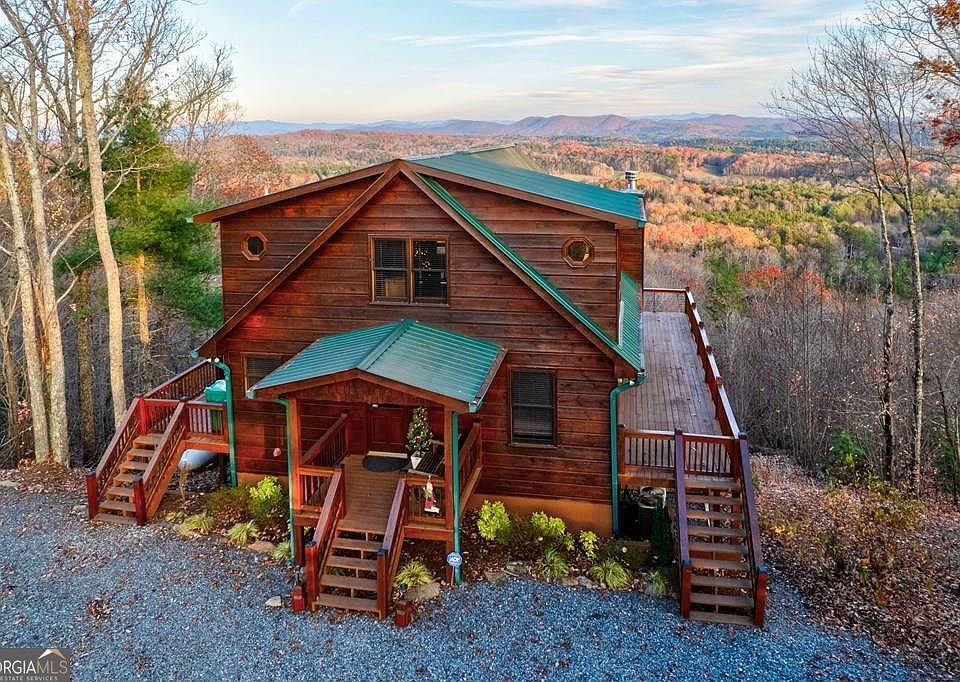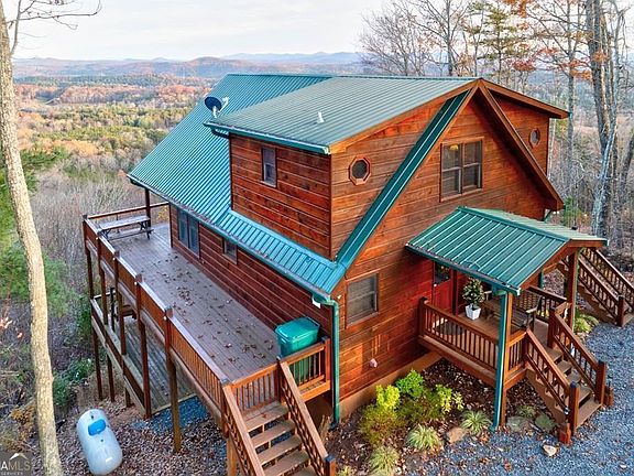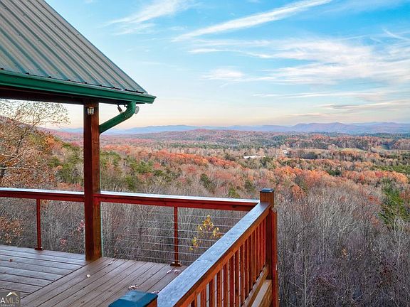 AMAZING VIEWS! Phenomenal long range mountain views. Brasstown Bald can be seen on a clear day. As a short term rental, there is a great rental history and is beautifully maintained. The home boasts multiple outdoor spaces including two covered porches, or a patio with a hot tub to watch the sunrise to a firepit to watch the sunset. There are 3 bedrooms, 3 bathrooms, great room (on the main), and bonus room for entertaining in the basement. The stainless steel appliances, warm wood interior and 2 stone fireplaces make this house a home. Most of the furniture and pool table is included on a separate bill of sale.
