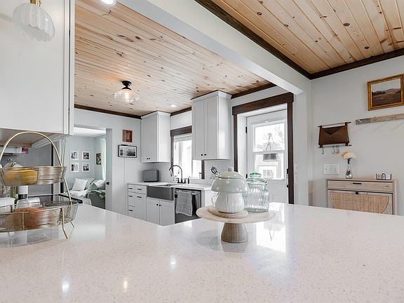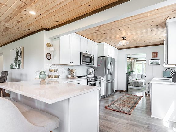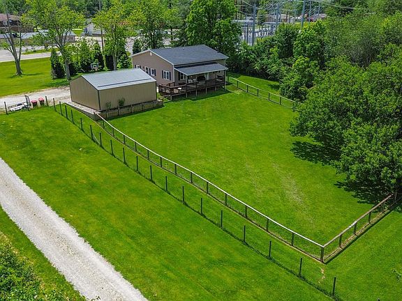 Charming Country Retreat on 2.5 Acres minutes from town! Move-in ready 3 bed (split floor plan), 2 bath home nestled on a picturesque 2.5-acre lot, perfect for those seeking peaceful country living. Enjoy abundance of natural window light and stunning views from the covered two-tier deck overlooking the backyard. The 1,520 SF home features beautiful tongue-and-groove ceilings in the living and dining areas, can lighting throughout the main areas and tasteful paint palette throughout. Gorgeous kitchen with quartz countertops, breakfast bar, subway tile backsplash, white cabinets with easy close drawers, pantry cabinet for storage, deep drawers for pots and pans as well as trash drawer for 2 cans. Stainless appliances are included (refrigerator, microwave, dishwasher & range). Both spare & primary bathrooms have been updated with solid surface countertops, white vanities, tub/shower combos and primary bath with large make up vanity. The primary bedroom boasts double closets, accent wall & has the flattering view of backyard. Another added bonus, one of the spare bedrooms features a stylish shiplap wall and the other features deep closet. Modern conveniences include, Pergo Laminate flooring throughout and a laundry area with ample storage and spacious living room. Concrete around home and in the pole barn was added in 2021 as well as the electric and LED lighting in Pole Barn. To complete this idilic setting are the trails in the wooded acreage which extends the fenced in area of backyard. Sellers have included a 1 year home warranty, roof is approximately 5-6 years old, replacement windows, keyless entry and so much more you will want to see this home in person so you can capture the true picture.