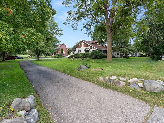 PRICED TO SELL! Incredible opportunity to turn this property into your dream home! Sitting on 1.88 acres, you'll enjoy country living while being just minutes from shopping, I-96, state & metro parks, as well as Downtown South Lyon. This Craftsman home, built in 1917, is where historic charm meets the modern need for space. An expansive 28 ft covered porch is just waiting to welcome you inside. Original features include doors & hardware, built-ins, hardwood floors, 8" baseboards, and heavy plaster crown molding. A great room was added onto the home with a soaring cathedral ceiling, skylights, floor to ceiling stone fireplace, front bay window, extra large rear windows, and door to deck. This addition made way for a 1st floor primary suite, utilizing the original living room. Stunning pocket doors welcome you into the space from the formal dining room. Here you'll find a spacious bedroom and walk-in closet. The large primary bathroom features a jetted tub and oversized stand-up shower. The kitchen features an island with gas cooktop, loads of cabinets, coffee bar, and an eat-in area. At the rear of the home is a mud room w/ laundry hookups, as well as a separate flex space w/ plumbing - a perfect place to create a dog washing station or an in-home salon. Upstairs you'll find a bedroom with an attached room that would be perfect for an office or library, plus 2 additional bedrooms, all with generous sized closets, as well as a full bath. If the 3-car garage doesn't impress you, you'll love the century old barn! With a cement floor, it's divided into 4 bays and has a 2nd floor for additional storage. There are also 2 sheds and a block outbuilding on the property, as well as an above ground pool & pool house.