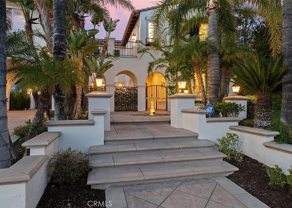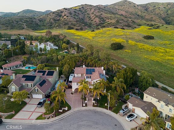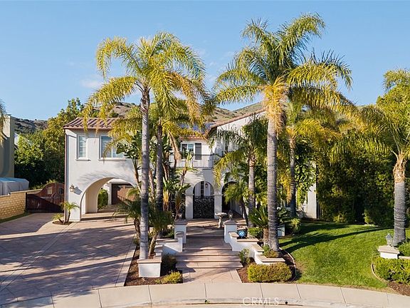 Discover an elegant Silverthorne Spanish estate located in East Simi Valley. Situated in a prime cul de sac with approx 25,000 sq ft & backing up to open space give the homeowner a neighborhood feel with ultimate privacy. You will be drawn in by the mature palm trees that frame the home while custom hardscaping, exterior lighting welcome your guests. The tranquil sounds of the fountain set a relaxing mood under the grand arches in the front courtyard. The property offers generous parking, including a porte cochere and gated RV access next to the 3 car garage. Step inside to soaring ceilings, abundant natural light, and custom details including a stunning tile staircase with ornate wrought iron railings. The light and airy formal living room is adorned with a grand fireplace and large windows, while the adjacent formal dining room includes a custom niche ideal for serving or storage. For added convenience the butlers pantry connects the dining room to the heart of the home which is the chefs kitchen. Maple cabinetry, granite counters, stainless appliances including gas cooktop, double ovens & built-in microwave are the backdrop to the large center island with a breakfast bar. For all of your cooking essentials and snacks, the oversized pantry will provide all the storage you could want. The kitchen flows seamlessly into a bright breakfast nook and a warm inviting family room with a fireplace, recessed lighting, custom shelving, surround sound, and direct access to your entertainer’s paradise backyard. Upstairs discover three generously sized guest bedrooms—two connected via a Jack & Jill bathroom. The spacious loft leads you to flex space perfect for a gym, library or play area. The luxurious primary suite rivals those found in a 5 star hotel. This private retreat is complete with a sitting area, cozy fireplace, built-in bookshelves, balcony access, and a spa-like en suite bath with dual vanities, soaking tub, separate shower, and large walk-in closet. Separate but connected by an outdoor bridge walkway you will find a casita that can host long term guests, an office or studio. In your backyard oasis find a gated pool/spa with beach entry, built-in BBQ, firepit, expansive lawn, and multiple sitting areas. Highlights of this estate include 5 bedrooms including 1 downstairs with a full bath, a family friendly neighborhood with hiking trails, solar panels, and much more! It's the total package of comfort, sophistication, and outdoor luxury.