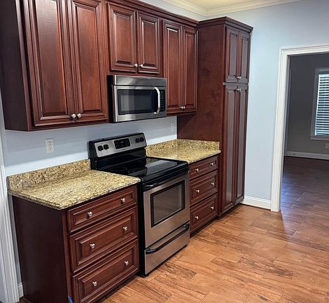 This is a quant Bungalow is less than 8 minutes from Waycross with lots of space. Enjoy cooking in a modern kitchen with rich cabinetry and granite tops. This dream kitchen comes fully equipped with a pantry, ice maker, self-cleaning oven, microwave hood and dishwasher. The entire apartment is floor to floor wood looking tile and accented with beautiful molding. A walk-in closet in the master along with a tub shower combo and a linen closet inside the bathroom. Granite tops in both baths and towel racks.