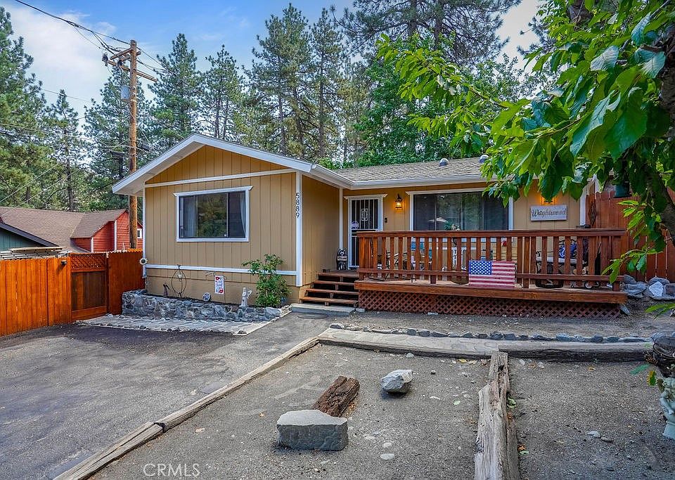 Entering into an open floor plan with vaulted ceilings a beautiful fireplace, laminated flooring and large windows. Kitchen has stainless steel appliances and the refrigerator is included! Stove, microwave, sink & faucet are new. This cozy home features a primary bedroom with a full bath. Inside laundry area with washer and dryer also included.