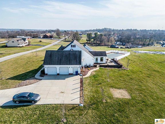 Here is your chance to own your dream home! Gorgeous modern farmhouse located just 2 miles out of the city limits of Greensburg and 11 miles from Campbellsville in the much desired Marshall Ridge area 1/2 mile from the Green County Country Club and Golf Course. This 4 bedroom, 2 1/2 bath home is situated on 1.71 acres with a magnificent view of the countryside. The home has over 3,000 square feet of living space on 2 floors with an entertaining area extending to the outside. You will absolutely love the wrap around porch with gazebo, covered rocking chair front porch and backyard with in-ground sport pool and patio area. Completing the well landscaped, outdoor space is a large yard area for play, a garden space, raised beds and a kennel. Once you step inside, you will be impressed with a beautifully designed and well laid out floor plan. A large open concept living, kitchen and dining area with fireplace invites you in. Flooring on the main floor is a beautiful hardwood and tile. Natural gas heat will keep you warm. The well appointed kitchen features a center island, stainless steel appliances and white cabinets with upgrades. Steps from the dining area is a sunroom with cathedral ceiling, wooden beams and large picture windows to take in the view. Completing the main floor is a primary bedroom with en-suite bath, french doors leading to the porch and huge walk-in closet, office, guest bath and main floor laundry with pantry. Upstairs you will find 3 additional carpeted bedrooms with walk in closets, another full bath and attic storage space. A two car attached garage with golf cart garage will hold your autos and toys.