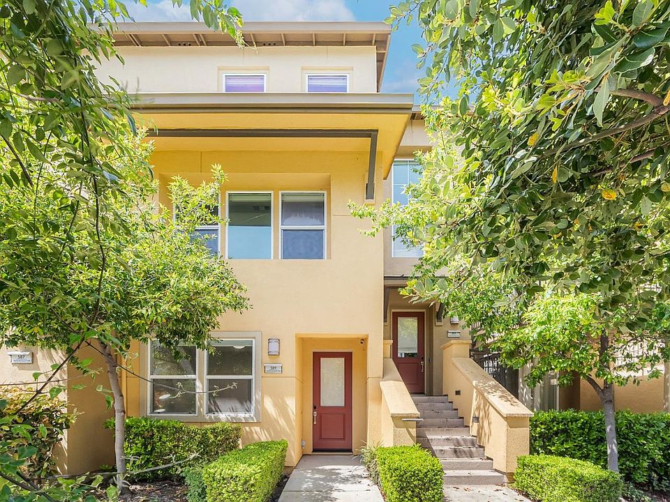 Step into modern living with this beautifully maintained tri-level east-facing townhome offering 3 bedrooms and 3 full baths. Located in a desirable and well-kept community, the flexible layout includes a ground-level bedroom and full bath, ideal for guests, in-laws, or a home office. The bright main level features an open-concept living and dining area with large windows, premium flooring, and smart home features. The upgraded kitchen boasts top-of-the-line maple cabinets with built-in organizers, stainless steel appliances, a built-in desk, and breakfast bar. A private balcony just off the kitchen is perfect for morning coffee or evening relaxation. Upstairs, the primary suite includes dual walk-in closets and a large bath with dual sinks and a glass-enclosed shower. A second en-suite bedroom adds comfort, while the convenient upstairs laundry enhances everyday ease. Enjoy resort-style amenities including a clubhouse, movie theater, gym, BBQ area, playground, putting green, and trails. Water and garbage included in HOA dues. Surrounded with parks, walks to groceries, restaurants, and only minutes from Downtown, major freeways, and top tech companies like Apple, Google, Amazon, and Nvidia. This home is move-in ready with the perfect blend of comfort, convenience, and location.