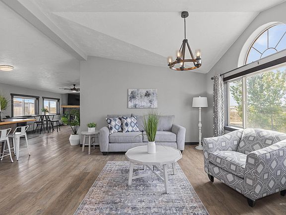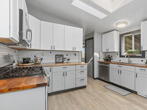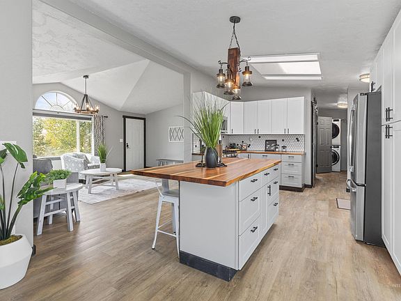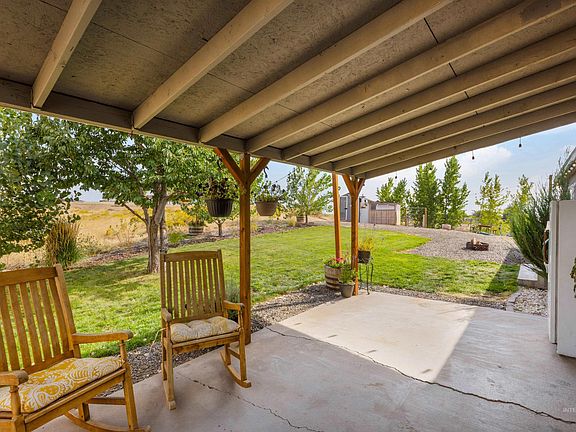 Welcome to your fully updated home on the hill! Looking for space and a peaceful property to make your own; look no further. Perched on nearly an acre and a half, this move-in-ready home offers versatility to create your hobby farm or simple oasis away from the city. Every detail throughout the house has been impeccably updated, including a brand new kitchen equipped with a gas range, an island with seating and a sky light that highlights the beautiful Acacia wood countertops. The new Grand Teton pellet stove is the perfect spot to cozy up by all winter long, it even has bluetooth control from anywhere. The master bedroom suite is a private retreat with designer tile walk in shower, corner soaker tub and walk in closet.New flooring throughout. Fresh paint. Newer roof. New insulated 16x10 vaulted 12' ceiling tuff shed wired for mini split.Detached garage for 2 vehicles + storage. Easy freeway access and only 20 min into Emmett town. Plenty of room to build a shop, bring your animals & toys. No hoa.