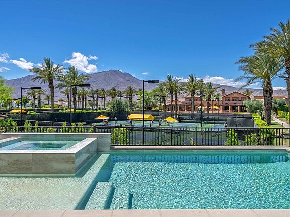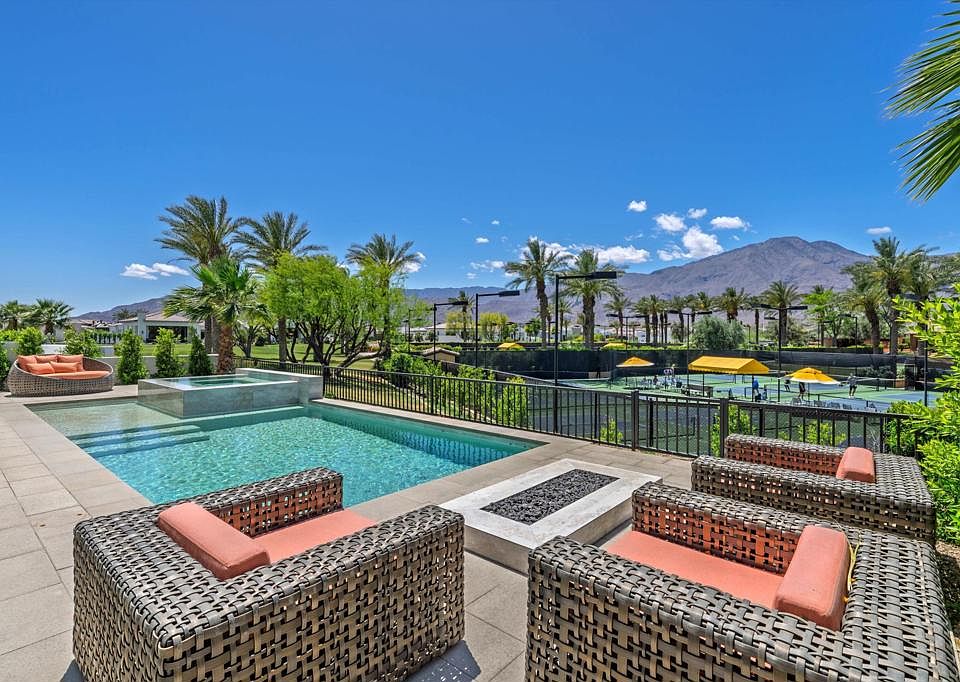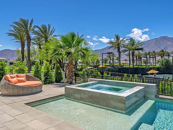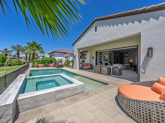 Experience the essence of desert luxury in this beautifully upgraded 3-bedroom, 3.5-bath Villa at Andalusia Country Club, complete with a private detached casita and ideally positioned on a premium lot near the clubhouse. Showcasing 180-degree views of the Santa Rosa and Coral Mountains, this 2,634 square-foot home blends sophisticated desert contemporary design with an open-concept layout and seamless indoor-outdoor living. Thoughtful upgrades include oversized porcelain tile flooring, custom designer lighting, motorized shades, a striking floor-to-ceiling fireplace, and expansive glass pocket doors that open to a covered loggia with recessed heaters and a built-in BBQ. The chef's kitchen features a granite waterfall island, sleek self-closing cabinetry, custom tile backsplash, and high-end stainless steel appliances. An adjacent custom bar with seating for eight creates the ultimate space for gathering. Wake up to breathtaking mountain views from the serene primary suite, complete with dual vanities, a spacious glass-enclosed shower, and a custom walk-in closet. Step outside to relax in the custom pool and spa, or gather by the firepit to watch the sun set behind the mountains. Additional highlights include an owned solar system, whole-home water softener and conditioner, gas and water auto shut-off valves, and epoxy-coated garage floors. Come live the life you've always imagined!