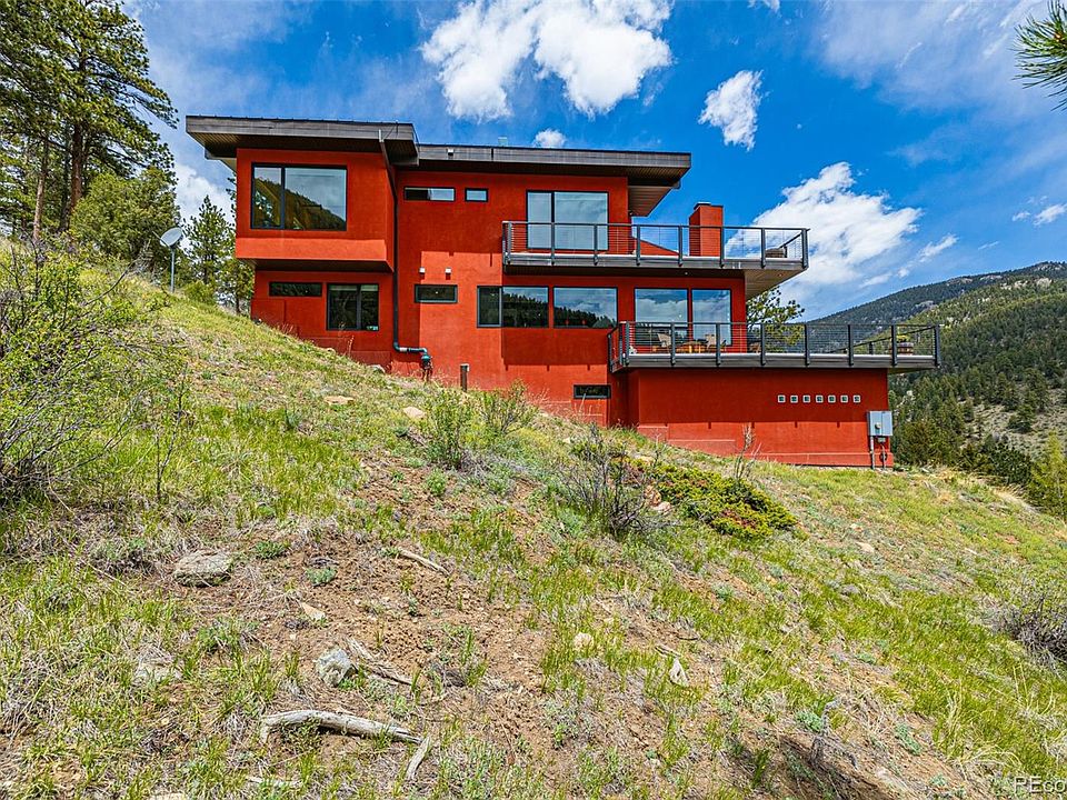 here. Designed by Gettliffe Architecture in Boulder, the home blends modern green design with mountain serenity. Fire-