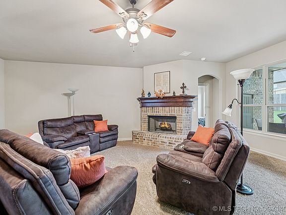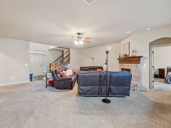 En-suite with Tres-Ceiling, private bath features double vanity, Garden tub, separate shower, walk-in closet. Two additional bedroom down with walk-in closet. Hall bath with double sink vanity. One bedroom up with walk-in closet, private bath. Good size game room or theatre. Walk out storage, separate utility down. Backyard is inviting with the charming Arbor, patio furniture and fireplace stays which makes this an awesome place for outdoor parties. Neighborhood has pool, park and trails for additional features and entertainment. Close to expressway and shopping.