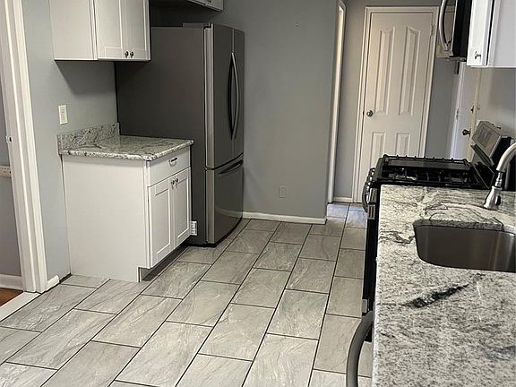 Kitchen with granite countersStainless appliancesOpen floor planSpacious updated bathroomWhite cabinets