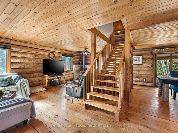 Step inside this gorgeous Western Redwood Cedar, round log home featuring 4 spacious bedrooms, 2 full Bathrooms and over 3000 Sq. Ft of living space. Living is easy here with main floor laundry, a master bedroom with vaulted ceilings, loft space and skylight as well as the potential for an in room shower! Pine plank flooring warms the home throughout. A cozy open living room features a gorgeous Pacific Energy wood stove while the formal dining area flows into the newly updated country kitchen overlooking the very private backyard. The fully finished basement is great for guests and holidays with a rec room, lots of storage and a propane fireplace adding to the ambience. Outside you are greeted with a 34 foot Quonset Garage with hydro and loft storage PLUS two attached drive-sheds for the toys. The 200x200 lot is perfectly landscaped and ready for entertaining and events, there's even a small bunkie ready to be repaired at your leisure. Very private location with a well treed perimeter. Only a short walk or ATV ride to Lake St. Peter provincial park, beach and boat launch, highlighting the natural beauty of the area. Just a short drive to amenities, 20 minutes to Bancroft and 20 minutes to Algonquin Park East Gate. Snowmobile and ATV trails only a few minutes away. Drilled well, septic and high speed internet.