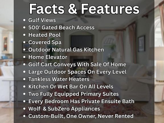59 Ballamore Cove is a custom-built, one-owner home with Old Florida charm & top-tier luxury finishes including a home elevator, heated pool, covered spa, Wolf & Subzero appliances, a natural-gas outdoor kitchen, & a street-legal LSV (golf cart) that conveys with the sale of the home. This property sits on a quiet cul-de-sac, has a two-car garage, and is located 0.1 miles from a gated beach access that presides over 500' of private beach. The soul of this home is family, and it permeates every aspect of the design choices. As the saying goes, 'it's the little things that matter', and little custom details set this home apart. Some details that immediately stood out to me: The stucco looks like it is meticulously maintained
