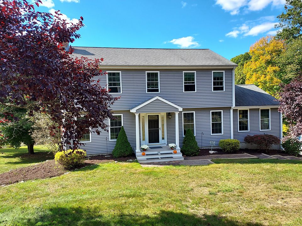 Back On Market-Completed Septic Repair! Joshua Farms Neighborhood setting w/views overlooking dedicated open space land is the start of this 2180+ SF 4 BR Colonial featuring significant interior & exterior renovations, remodeling, & upgrades within past 10+ years. Renovations include 2015 installation custom kitchen, new cabinetworks, quartz counters, 3.6' x 7'+ quartz top island food prep counter w/seating for 5, hardwood floors, 5 Burner Gas Bosch Range & structural modifications creating an open kitchen-dining room floor plan! A front to back hardwood floored living room has a masonry fireplace w/Buck wood burning insert! A second masonry heat-o-later fireplace graces the 14'x 22' cathedral ceiling family room w/sliders accessing two exceptional outdoor entertainment areas! These spaces consist of private 14'x23' roof covered Trex deck w/four skylights plus overhead fan/light unit adjoining an open 14'x27' sun deck both w/valley views! The 2nd floor plan included 4 Bedrooms all w/hardwood floors plus 2 full remodeled baths! The Primary BR Suite features a remodeled tile wall walk in Shower and walk-in closet! The walk out lower level has Rec Rm area of 400 +/- SF needing some finish work with an adjacent drain plumbed additional future 1/2 bathroom! Oil fired bruderus high efficiency multi zone boiler, 200 AMP Service, & Private Well & Septic! New Siding 2014, New Roof 2007, Deck & Porch 2017! Paver Walkway, Paved Drive w/2 Car Under Garage! Septic Repair Complete Feb 2025