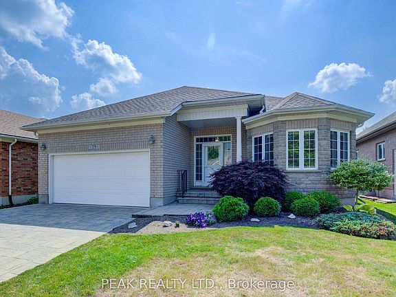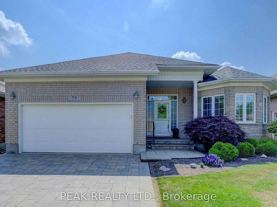 Welcome to 59 Devonshire Drive, a lovingly maintained Waterford Model offering two bedrooms plus a den, 2.5 bathrooms, and over 2,700 sq. ft. of finished living space. The open-concept main floor features hardwood flooring, a bright kitchen with stone countertops, tile backsplash, peninsula seating, and California shutters. The spacious primary suite includes his-and-hers walk-in closets and an ensuite with double sinks and a low-barrier walk-in shower. A bright second bedroom, 4-piece bath, den with French doors, and main floor laundry with extra storage complete this level. Relax in the three-season sunroom overlooking lush greenery or entertain in the finished lower level with two large multipurpose rooms, a 2-piece bath, and abundant storage. Recent upgrades for peace of mind include roof, furnace, A/C, and attic insulation. Outside, enjoy an upgraded interlocking brick driveway, double garage, and serene surroundings. Stonecrofts 18,000 sq. ft. rec center offers an indoor pool, fitness room, games/media rooms, library, party room, billiards, tennis courts, and 5 km of walking trails. Come live the lifestyle at Stonecroft!