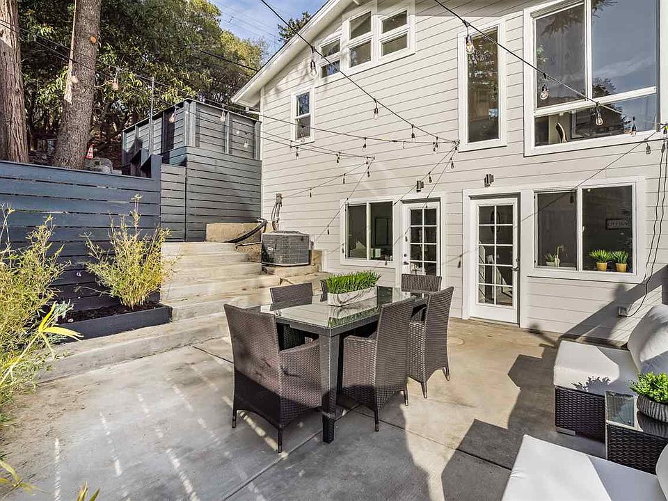 Back on the market after an extensive upper and lower patio remodel this home has been transformed for outdoor living. Completely reimagined, this 4 bedroom, 2 bath open concept home now offers two separate outdoor spaces to enjoy the serene setting and views to the west. The brand new 2 car side-by-side driveway provides easy access into the home and upper patio perfect for lounging or entertaining. Inside you'll walk into the open concept living and dining room area, highlighted by the soaring ceilings above. Flanked by the fireplace is the modern kitchen complete with counter height seating and chef's level Viking appliances. In the dining area floor to ceiling windows provide expansive views of the SF Skyline. Also on this floor is the master bedroom with walk-in-closet and full bath. Below are three spacious bedrooms and one full bath with access to the outdoors. Completely reimagined the lower patio has been expanded with upgraded lighting, landscaping & timed irrigation.