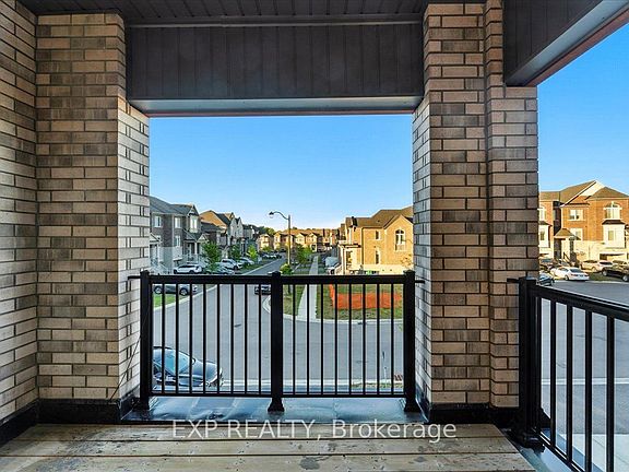 Welcome to 59 Gemma Place in Brampton's Heart Lake West, a 2022-built modern townhouse offering 4 bedrooms and 4 bathrooms. This home features an open-concept living area with hardwood flooring and large sliding doors leading to a front balcony. The chef's kitchen boasts quartz countertops, an extended breakfast bar, and stainless steel appliances, with the breakfast area opening to a balcony through French doors. An additional family living space is brightened by a large window. The primary bedroom includes a walk-in closet and a 4-piece ensuite. The second and third bedrooms are well-appointed with closets and windows. The fourth bedroom on the main floor has a 4-piece bathroom and a separate entrance from Conestoga Dr, complete with a coat closet and a second laundry room rough-in, offering potential for rental income and additional space via basement connectivity. The primary laundry room is conveniently located on the third floor, complete with a washer and dryer. Located near Sandalwood Park, Loafers Lake, grocery stores, public transit, and other amenities, this home combines comfort and convenience.