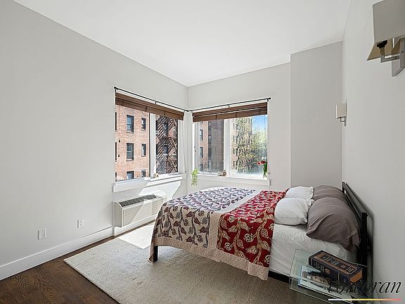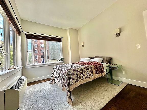 This modern, renovated apartment has plenty of space for living and dining. King-sized bedroom enjoys plenty of sunlight, with exposures through oversized windows on two sides. Washer/dryer in unit, good closet space (large double closet in bedroom, coat closet, pantry closet, laundry closet), stainless appliances, PTAC through-wall HVAC units. Living room opens to a 55sf balcony with room for seating and plants.