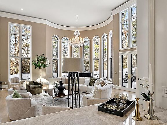 Indulge in exquisite comfort and luxury in this masterfully transformed estate, updated by Sterling Custom Homes and Renovations. Tucked within a quiet enclave of executive residences, this remarkable home is moments away from every convenience. The grand two-story foyer, with gleaming marble floors, introduces an interior that delights at every turn. The living room stuns with soaring ceilings, a beautiful bar area for entertaining, and a natural flow that connects effortlessly to both the custom dream kitchen and the breathtaking two-story library. Wrapping you in cozy sophistication, the library creates a versatile space with countless possibilities. Expansive windows throughout frame magnificent views of the surrounding natural beauty. The kitchen is a work of art, featuring a dramatic stone waterfall island and custom cabinetry. A striking two-sided fireplace, shared with the family room, adds both warmth and architectural distinction to this inviting space. The first-floor primary suite boasts luxurious finishes and a spa-inspired bath designed for the ultimate in relaxation. Upstairs, spacious and beautifully designed bedrooms and bathrooms provide comfort and privacy for family or guests. The expansive walkout lower level is created for entertainment, including a large recreation area, a generous bar, and a beautifully appointed ensuite bedroom. Outdoors, a serene stone terrace invites you to unwind amid lush natural surroundings and complete privacy. Designed by Art Harrison Interiors, this home reflects modern luxury at its finest, with every inch updated for refined, effortless living, including new plumbing, faucets, and hardware. Additional highlights include a whole-house generator, six HVAC units, and three hot water heaters, with two replaced within the past two years. The home also features four recently replaced furnaces, two newer air-conditioning units, and newly added heating in both garages, providing year-round comfort and convenience.