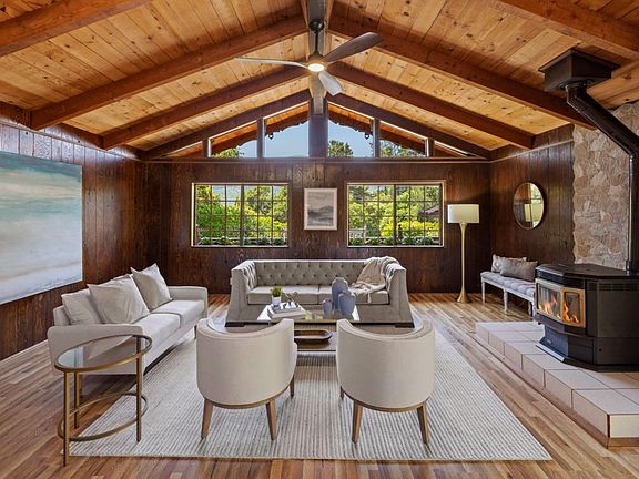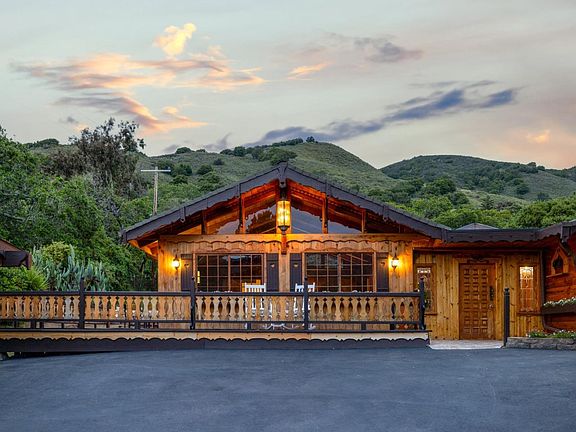 Indulge your European sensibilities with this Swiss chalet style home in Carmel Valley. A countryside retreat originally constructed in 1950 with a 1980 permitted addition, sitting on more than an acre of golden land, this is your opportunity to secure something special. From the moment you pull into the driveway, it will be delightfully clear that there is nothing "ordinary" about this property. Outside, a gable roof tops a layered, decoratively sculpted wood facade with two windows traditionally offset by flower boxes below and charming shutters on each side. Find intricately carved, whimsical details around every corner of the interior. Relax in a living room with pitched ceilings, architectural windows, and sliding glass doors that open onto a wraparound porch. Another living area with wall-to-wall windows, a fireplace, and knotty wood wall paneling sports a fabulous built-in dining table and opens into the kitchen. Discover a bonus room with vaulted ceilings off one of the living spaces -- an ideal guest wing. The property also includes a separate finished structure that could serve as another bedroom, a workspace, an artist's studio, or something else! Come walk the oak-studded grounds, and be inspired to cultivate a storybook life for yourself in a one-of-a-kind setting.