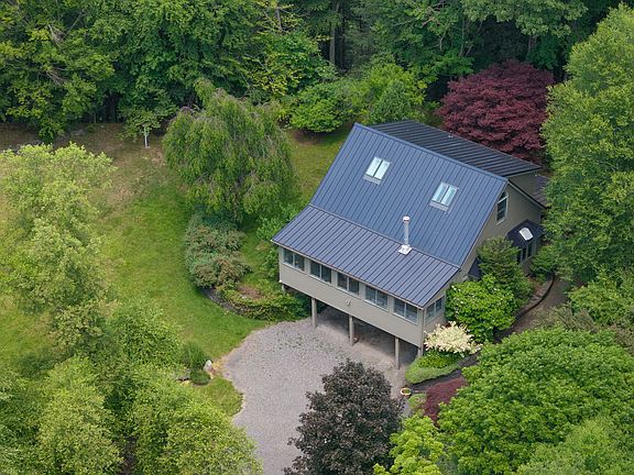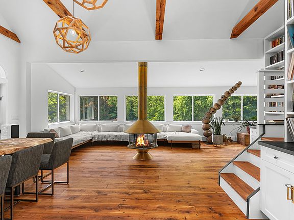 Welcome to 59 Macdaniel, your upstate country retreat nestled on 4.9 acres in the charming hamlet of Bearsville. Enjoy complete privacy with the home being set atop a hill, surrounded by lush trees, beautiful landscaping, and seasonal panoramic mountain views. The home has an open floor plan with soaring ceilings, exposed beams and flooded with natural light. The brass wood burning fire place is the focal point of the living space, gather around and get cozy while admiring the stunning grounds. On the opposing end of the living space is a nook currently set up as office space, ideal for those who work from home. Across you'll find a sliding barn door leading to the first bedroom, currently set up as an entertainment room. The living space connects seamlessly to the dining area and a chic kitchen. This space is a chefs delight, complete with, soapstone counter tops, farmhouse sink, large island with built in special edition Viking range, Miele fridge, Bosch dishwasher breakfast bar, custom cabinetry and much more. A spacious bedroom with large windows, high ceilings and adjoining full bath complete the first floor. Cascade up the grand staircase surrounded by bespoke built in shelving to the second floor. There is an open loft area currently used as guest space over looking the living area. Alas is the bright and airy primary suite with stunning windows, dual closets and ensuite bath. Heading out to the covered porch, which overlooks the gardens and provides convenient access to the kitchen, creates an ideal outdoor entertaining area. The stone grill is a work of art and fully functional using wood or charcoal to cook. Live in peace in serenity while being in close proximity to the bustling village of Woodstock, Hunter Mountain, Saugerties, Kingston. Discover the abundance of experiences the Hudson Valley has to offer, with a relaxing home waiting for your return. Seasonal Rental - 3 month minimum up to 12 month lease term available. Seasonal Rental- 3 month minimum up to 12 month lease term available. $5000/ month. No Utilities included. Lawn care and bi-weekly cleaning at owners expense. First months rent and one month security.