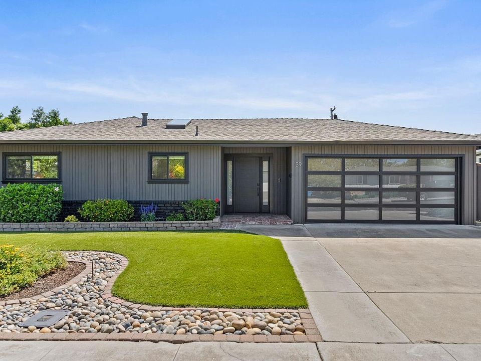 Welcome to this stunning home in charming Santa Clara! Featuring a striking color palette, clean lines, and beautiful landscaping. Curb appeal further enhanced with high-end glass-paneled garage door and modern front door with two sidelites. Stepping inside, you'll find a versatile and well crafted floor plan including 3 bedrooms 2 bathrooms and well sized living spaces. The light and bright kitchen is centered by a beautifully placed skylight with rope lighting, new stainless appliances and granite countertops. The dining/living room is equipped with a cozy fireplace and bay window with convenient bench seating. The breathtaking great room impresses with a soaring cathedral ceiling spanned by a gorgeous wood beam and center modern fan. A slider from the great room leads you to your outdoor haven with Trex deck, turf lawn, paver patio and low-maintenance landscaping. Additional upgrades include new recessed lighting and fixtures, wide plank engineered flooring/baseboards, fresh paint, and a sleek epoxy garage floor. Short stroll to Maywood Park, Eisenhower Elementary and Cupertino schools! Low Santa Clara utilities! Centrally located near Apple, Kaiser, Valley Fair, and Santana Row! Come see this special home today!